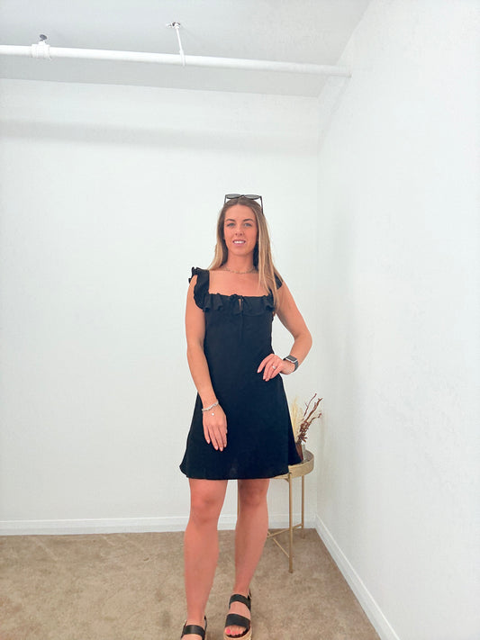 EX-New Look Frill Strap Black Linen Blend Mini Dress/Tunic