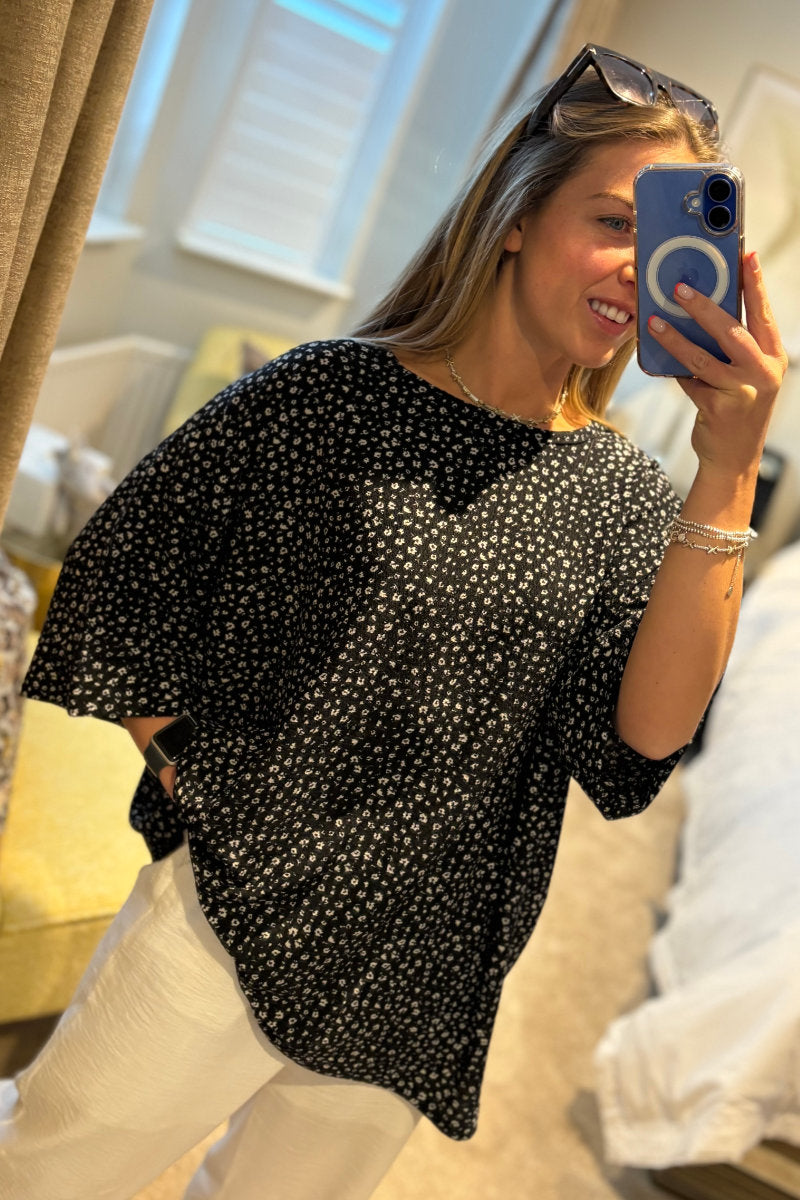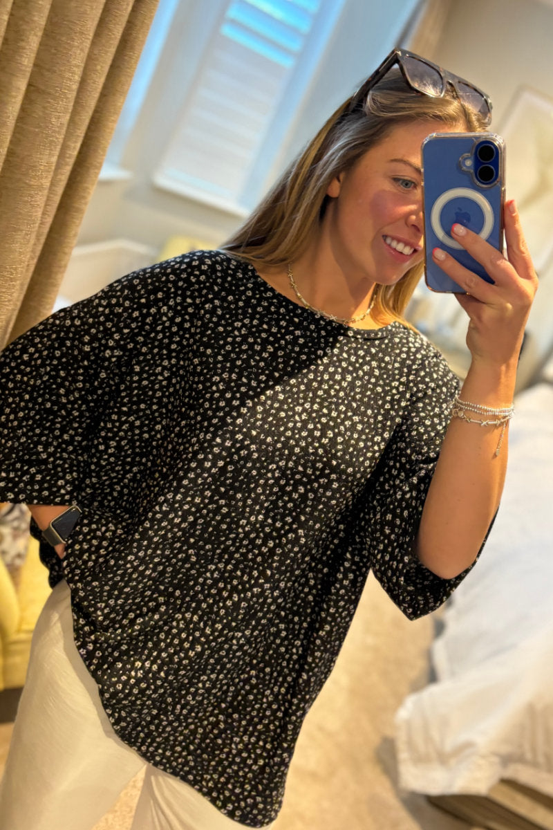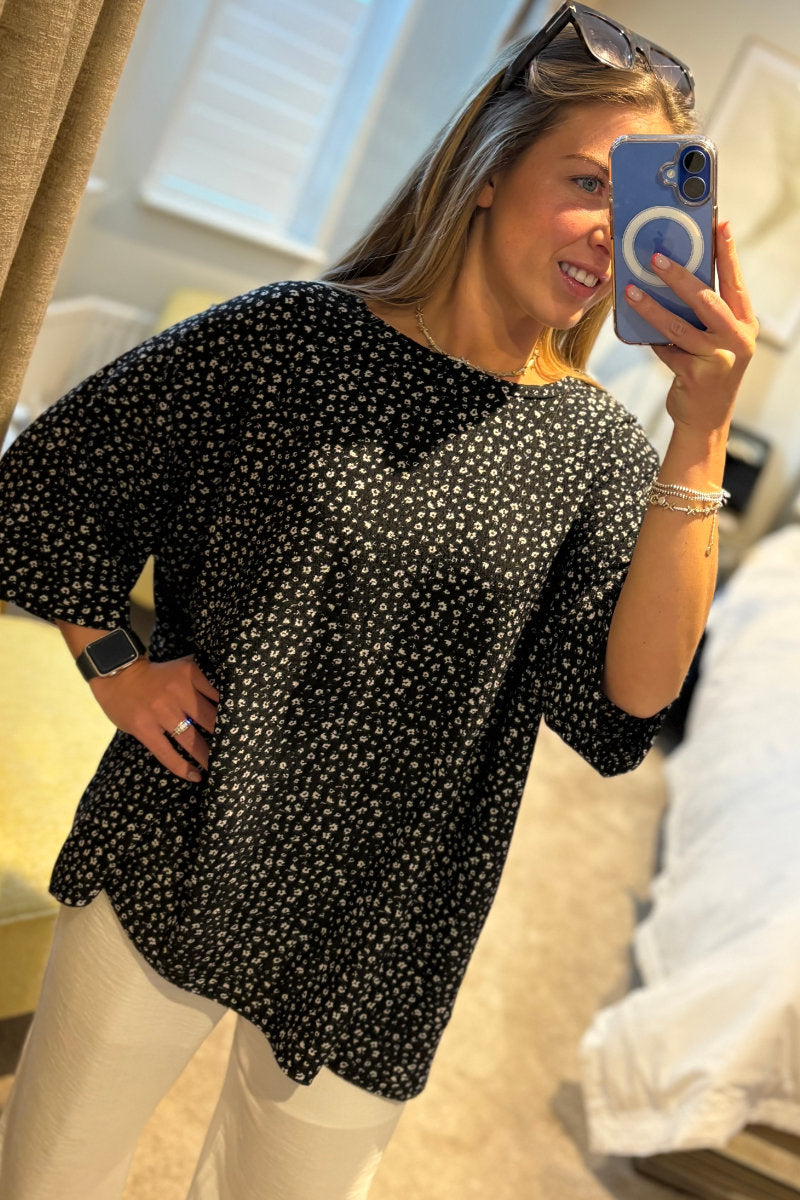 Add a touch of floral charm to your everyday style with this effortlessly chic black and white flower top. Featuring a relaxed, oversized silhouette with elbow-length sleeves, it's designed for all-day comfort and easy layering. The soft drape and simple print make it a versatile option for dressing up or down.