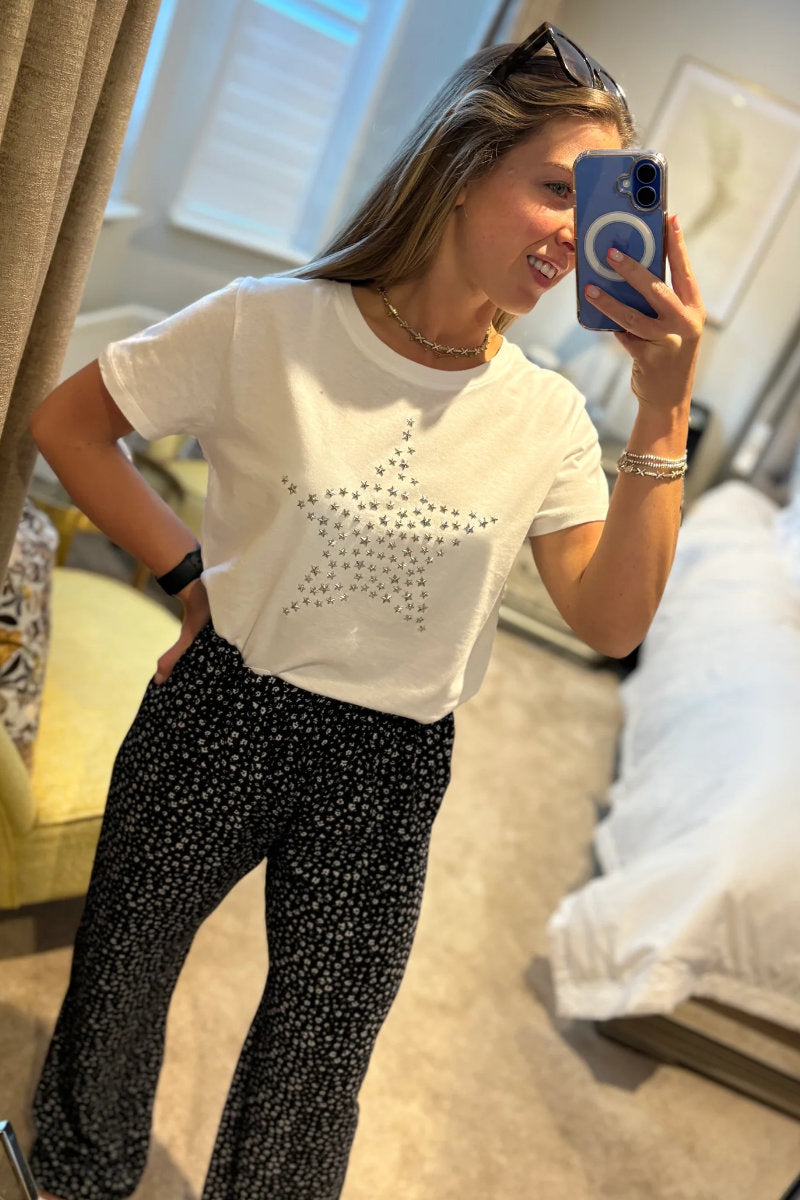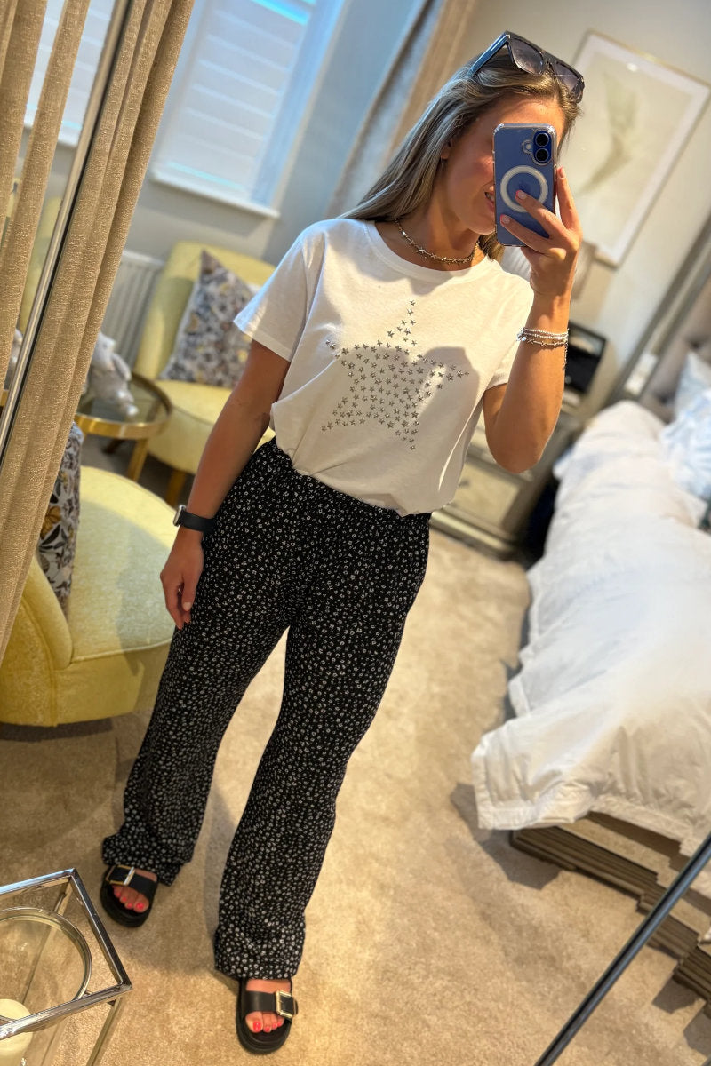 Embrace laid-back elegance with these lightweight black trousers, featuring an all-over delicate white floral print. With a relaxed, full-length fit and soft, fluid fabric, they’re perfect for both lounging and stepping out. Pair with the matching top or a simple tee for effortless styling.
