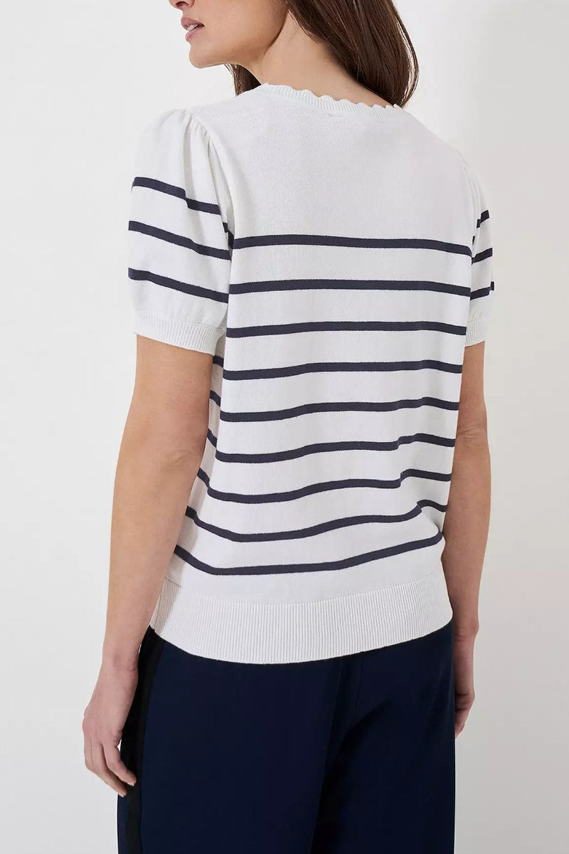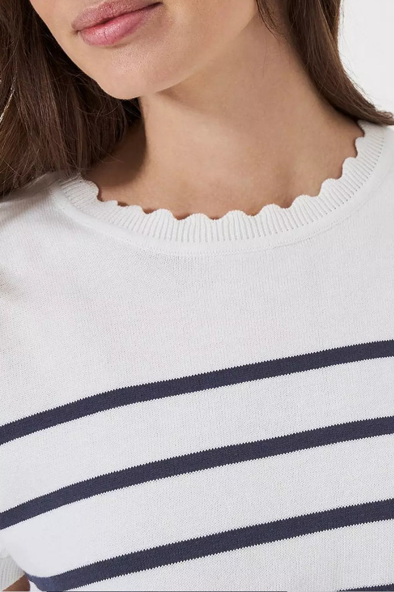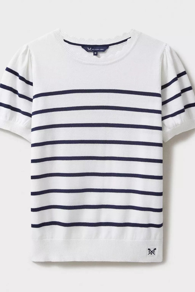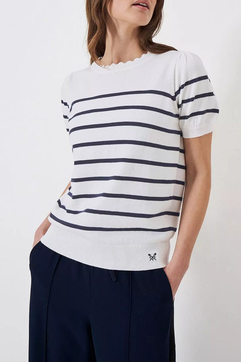 A fresh twist on nautical chic, the Crew Clothing Frill Neck Stripe Knit Tee brings elevated ease to your everyday looks. Crafted from 100% cotton, this lightweight knit is breathable and soft with just the right amount of structure to hold its flattering shape. The timeless navy stripe pattern sits against a crisp white base, while subtle puff sleeves and a scalloped crew neckline add a feminine finish.