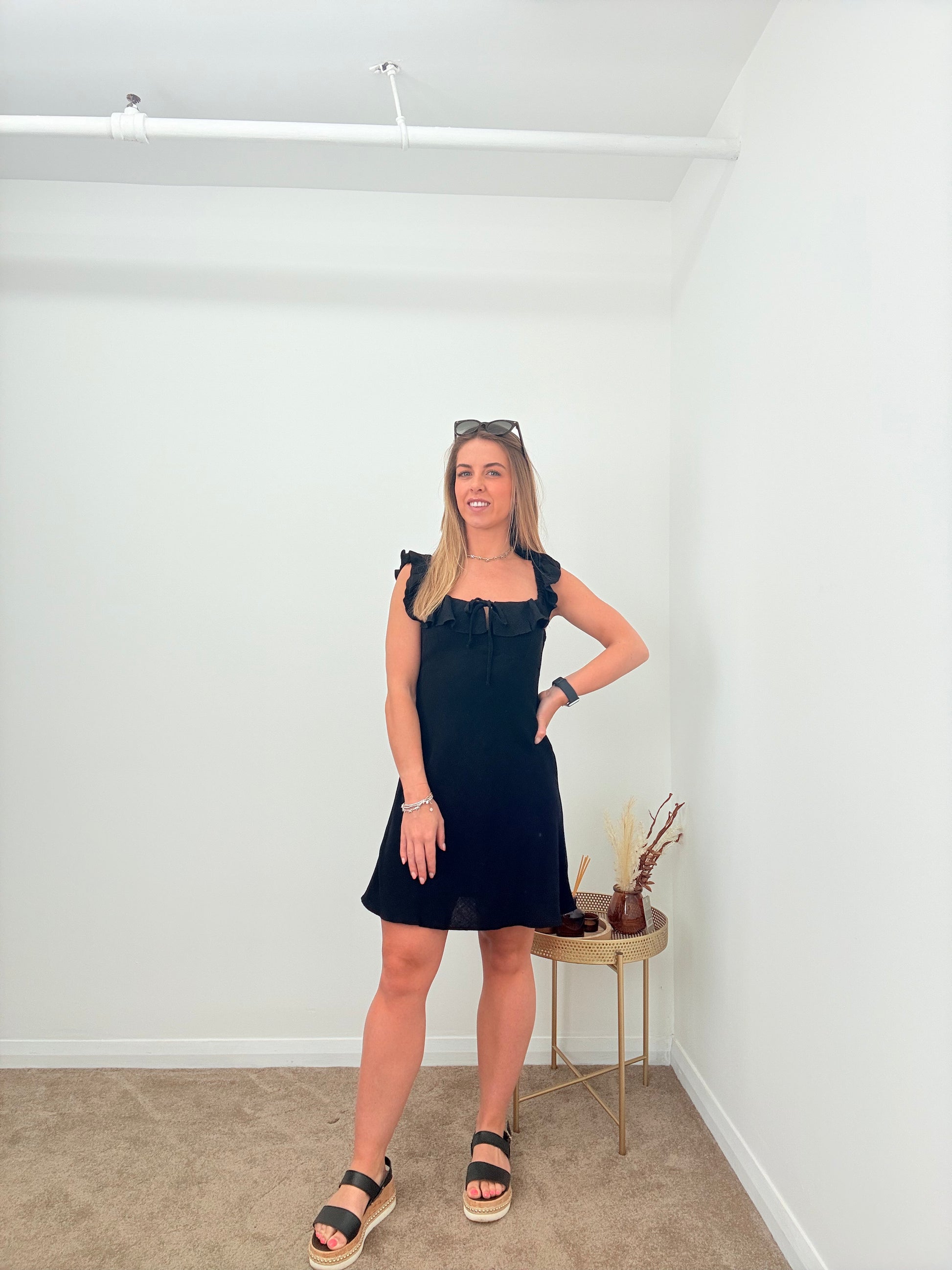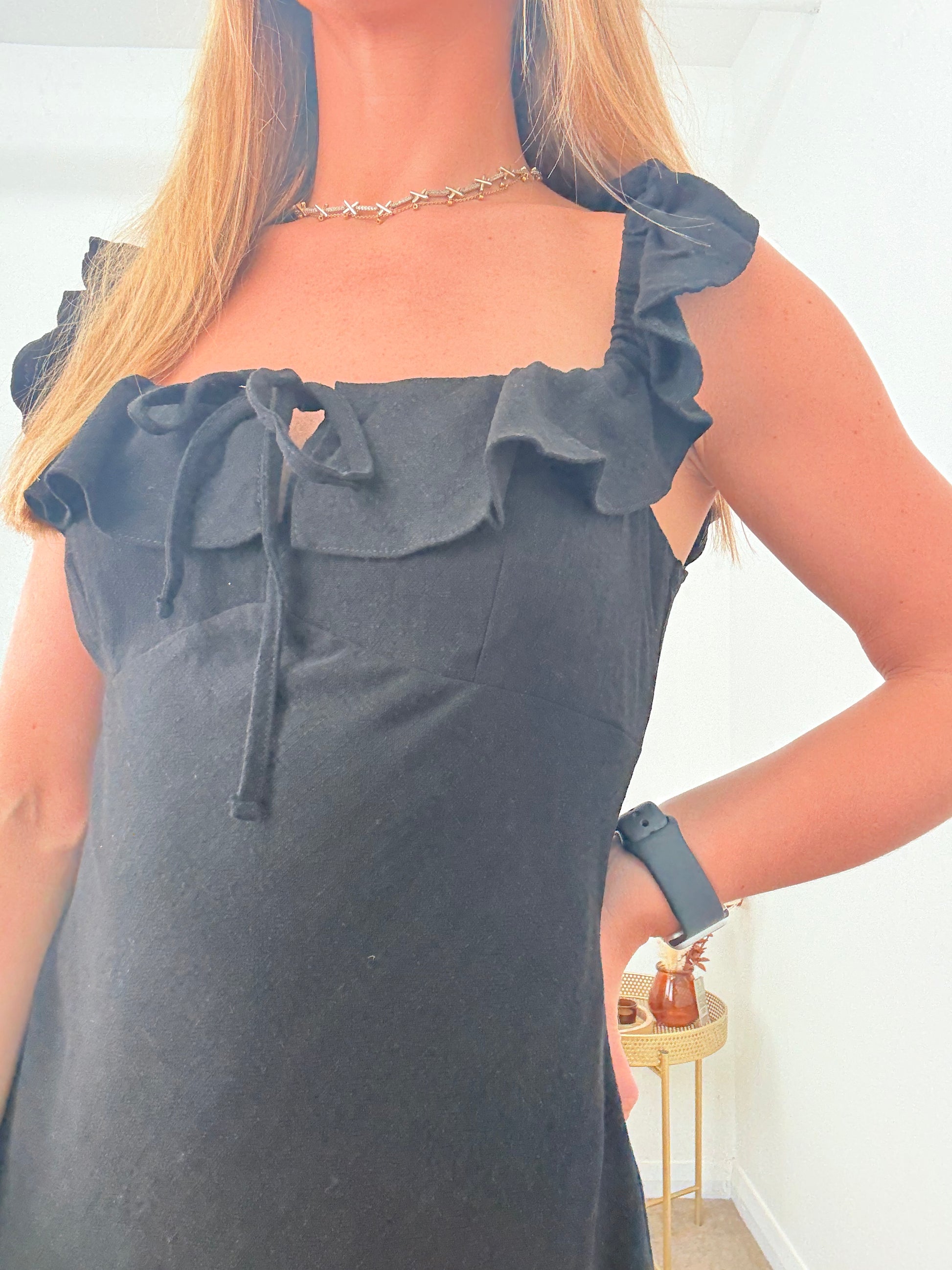 EX-New Look Frill Strap Black Linen Blend Mini Dress/Tunic