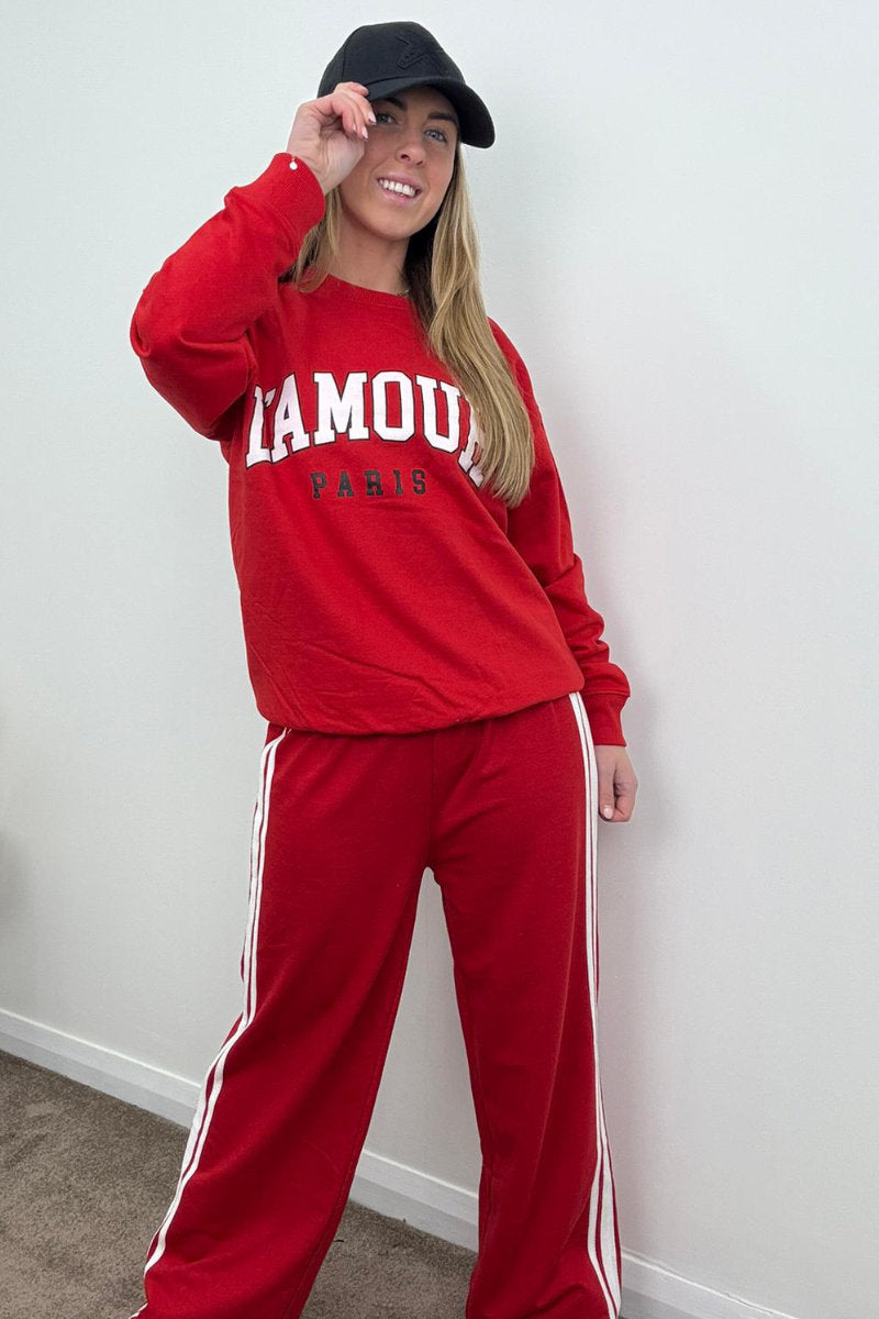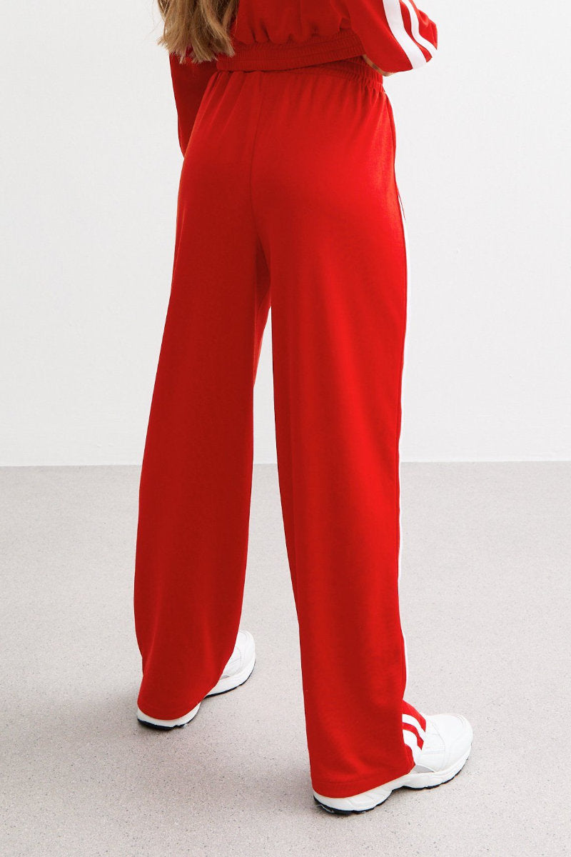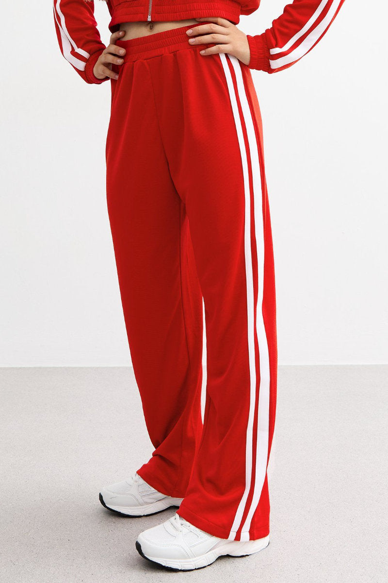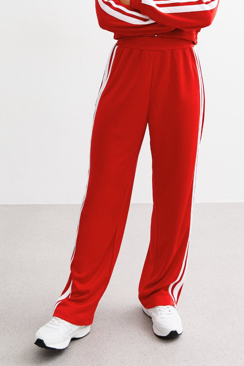 Bring a sporty edge to your casual wardrobe with the Red Striped Wide-Leg Joggers. Featuring a comfortable elasticated mid-rise waist and bold side stripes, these joggers offer a relaxed yet stylish silhouette. The full-length wide-leg design delivers both freedom of movement and an on-trend look, making them a versatile choice for everything from workouts to weekend lounging.