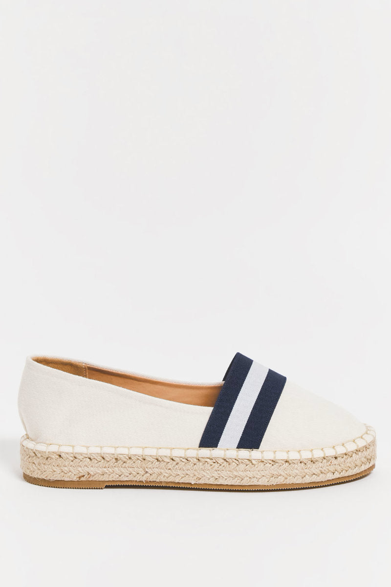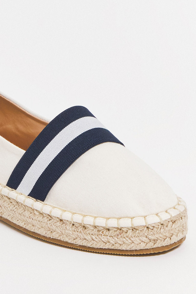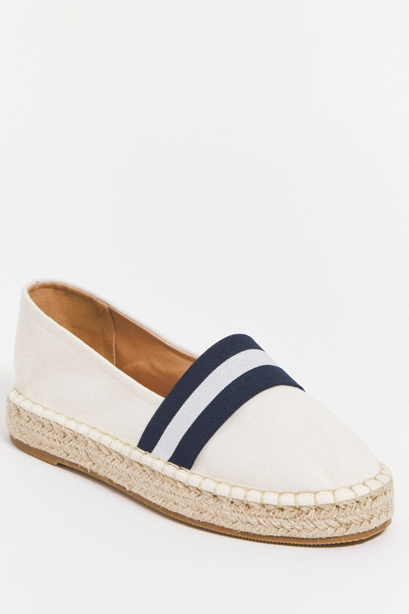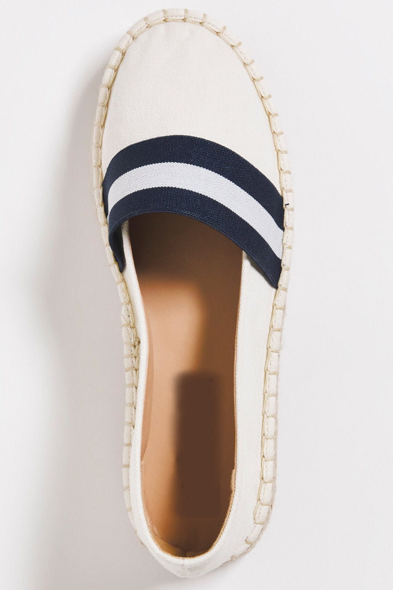 Step into effortless style with our classic white espadrilles, featuring a chic navy stripe across the front. These versatile shoes are perfect for adding a touch of nautical elegance to your casual wardrobe. Crafted from quality canvas, the upper is both durable and breathable, ensuring comfort throughout the day.