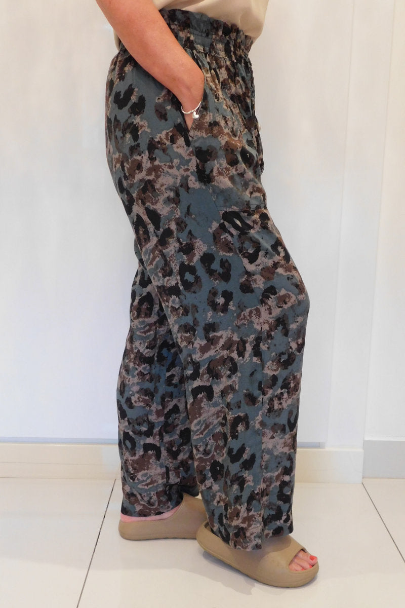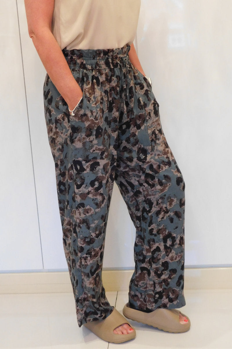 Famous Store Ladies Linen Blend Wide Leg Animal Print Trousers