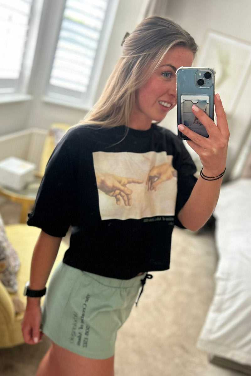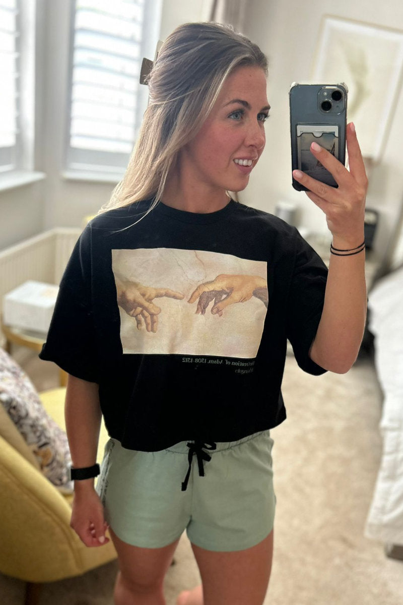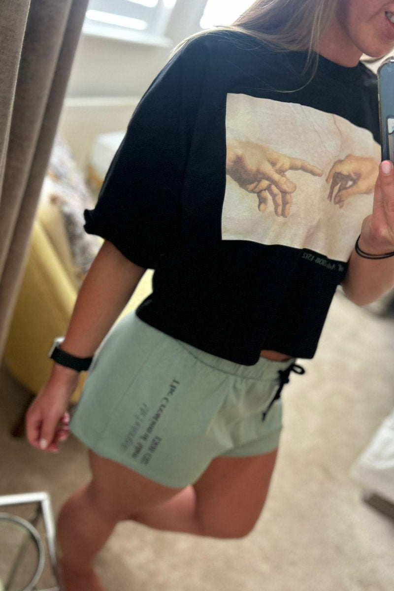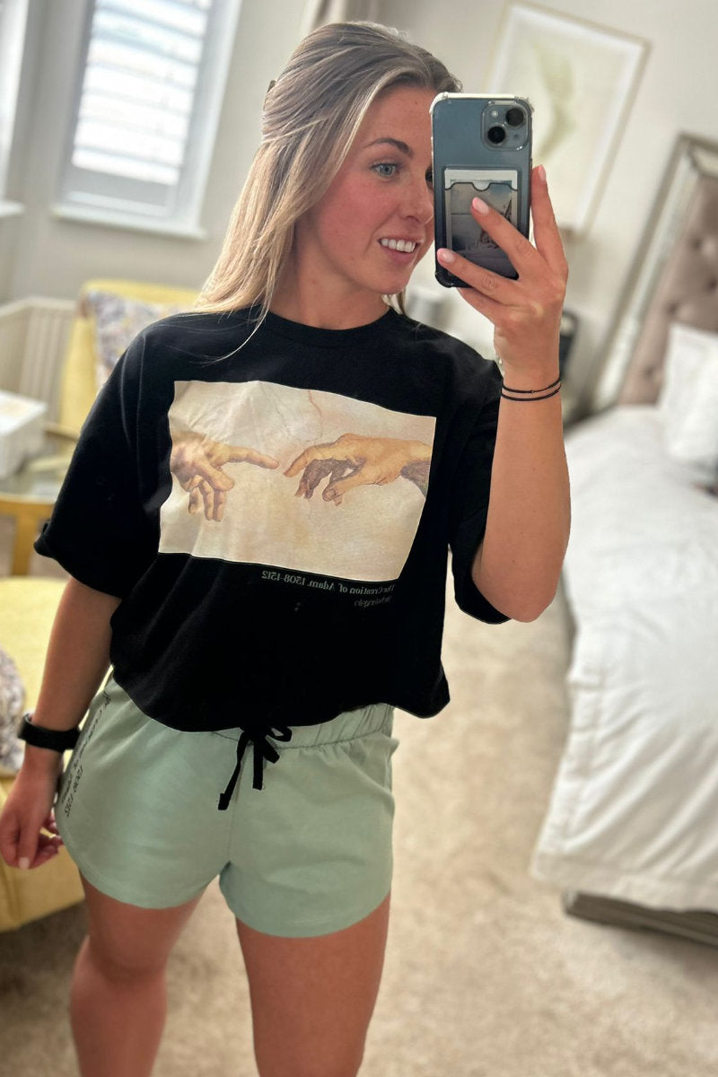 Give your loungewear a touch of artistry with this Michelangelo-inspired pyjama set! The set includes a cool mint-coloured shorts and a black T-shirt, both designed for a comfortable, relaxed fit perfect for unwinding. The T-shirt features a round neck and short sleeves, maintaining a classic style while showcasing a captivating graphic of a section from Michelangelo’s renowned fresco, ‘The Creation of Adam’. This iconic image adds an artistic flair to your casual at-home look. Ideal for pairing with soft slippers or just enjoying a lazy weekend indoors.