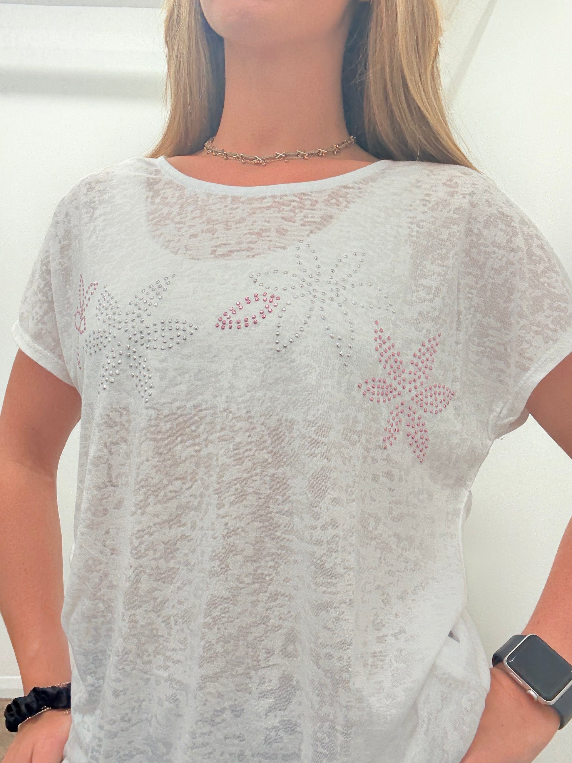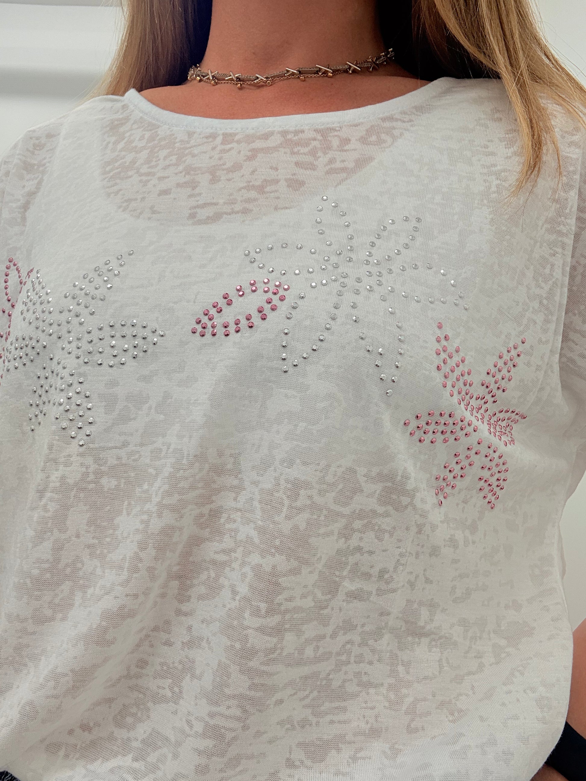 Discover the perfect blend of comfort and sparkle with our white jewelled t-shirt. Dress it up or down for any occasion and stand out effortlessly!