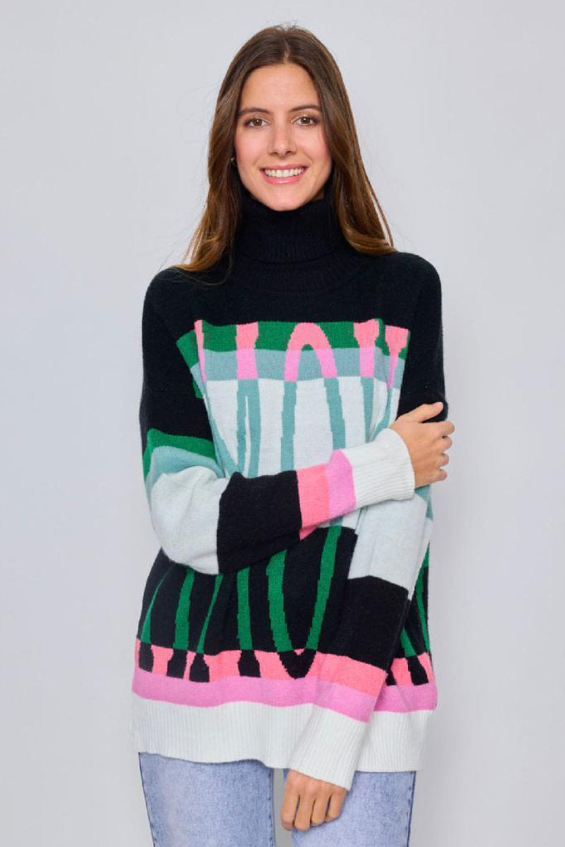 Celebrate love and style with the Amour Bold Stripe Roll-Neck Knit Jumper. Featuring the word "AMOUR" in a standout design, this jumper combines warmth with personality. The vibrant mix of beige, orange, yellow, and blue stripes creates a bold statement, while the cosy roll neck ensures comfort for colder days.