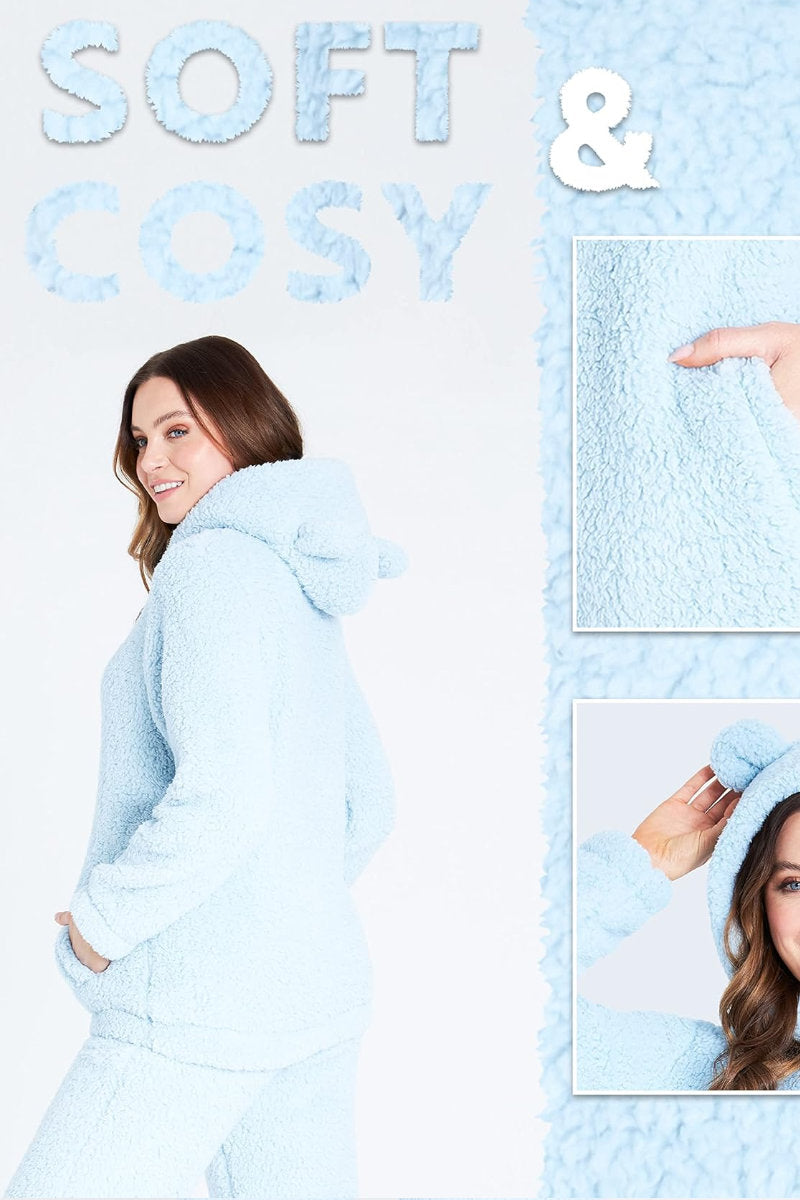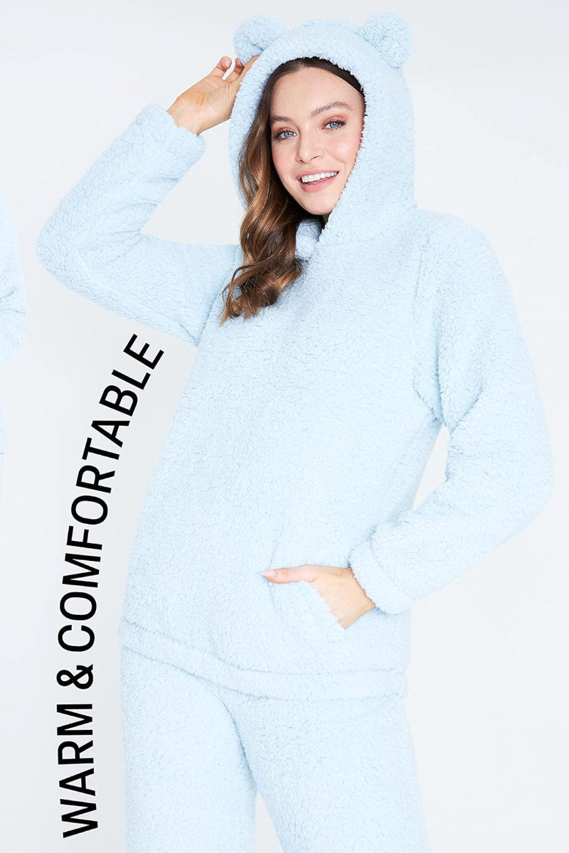 Snuggle up in ultimate comfort with the Ladies City Comfort 2-Piece Teddy Fleece Pyjama Set. Crafted from super-soft fleece (100% Polyester), this cosy loungewear set features a charming teddy bear design with cute 3D ears on the hood, bringing a playful touch to your winter wardrobe. Perfect for lounging at home, these fluffy pyjamas are ideal for chilly nights in.