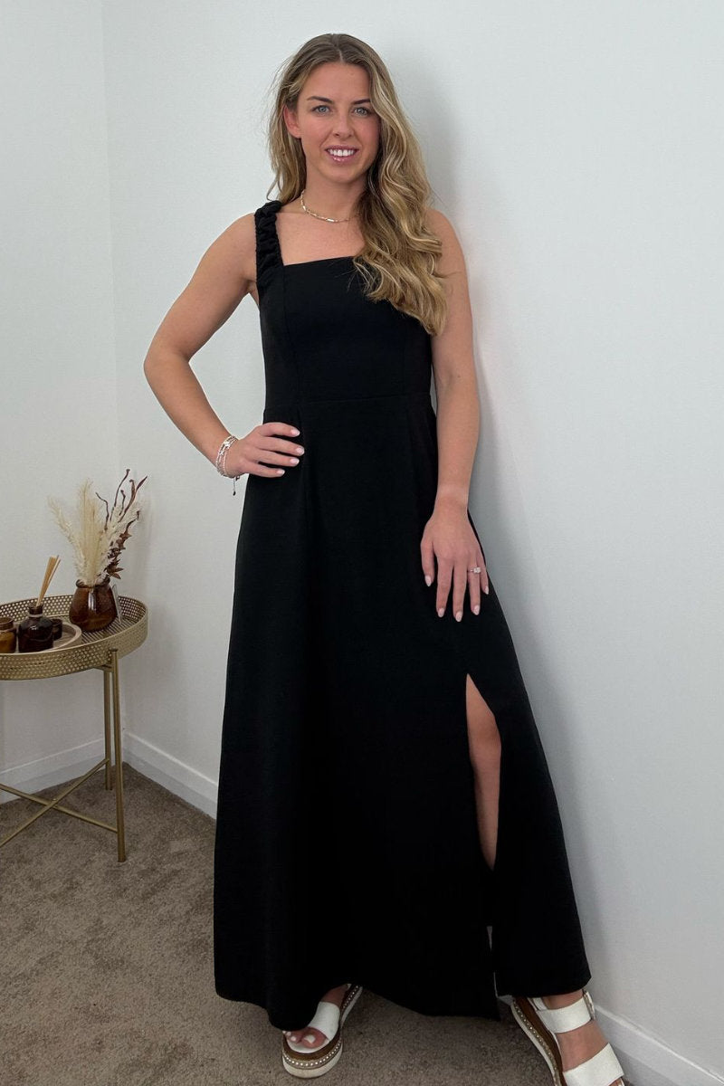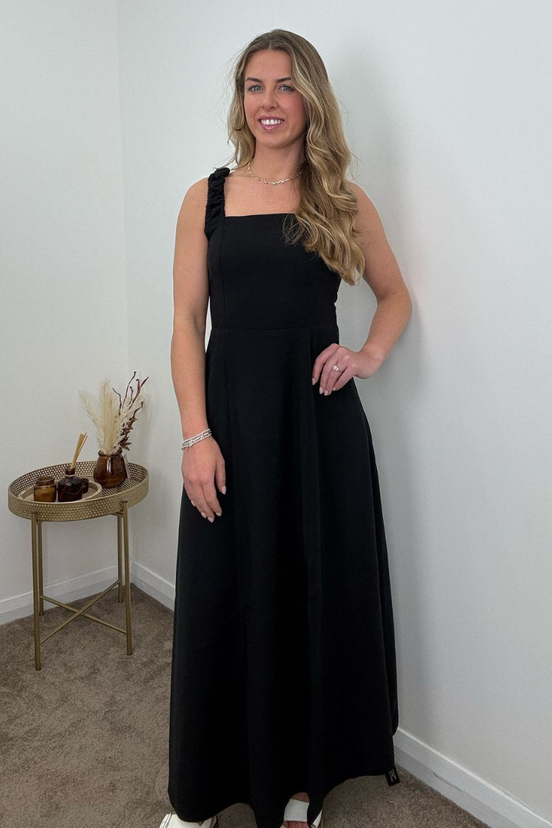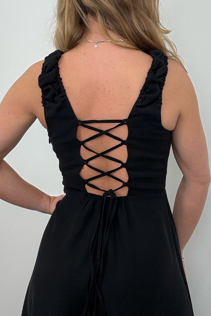 A timeless staple with a flirty twist, this Black Maxi Dress is perfect for day-to-night styling. With its structured square neckline and flattering A-line silhouette, the front keeps it sleek and sophisticated—while the lace-up back adds a playful edge. Whether you're heading to a summer event or dressing it down with flats for brunch, this is a must-have piece for effortless elegance.