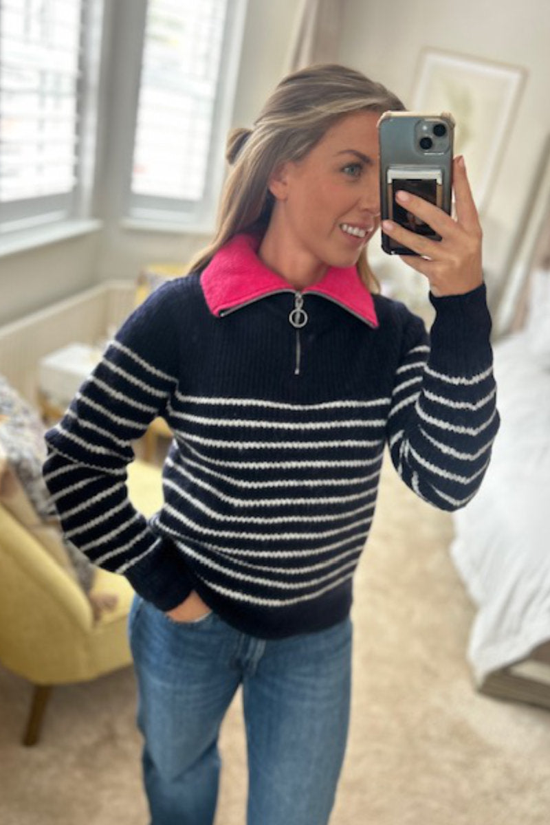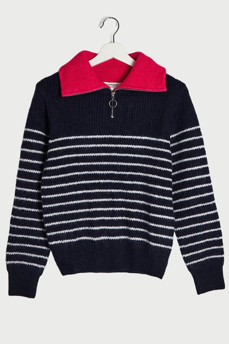 Naf Naf Zip Neck Navy Striped Jumper