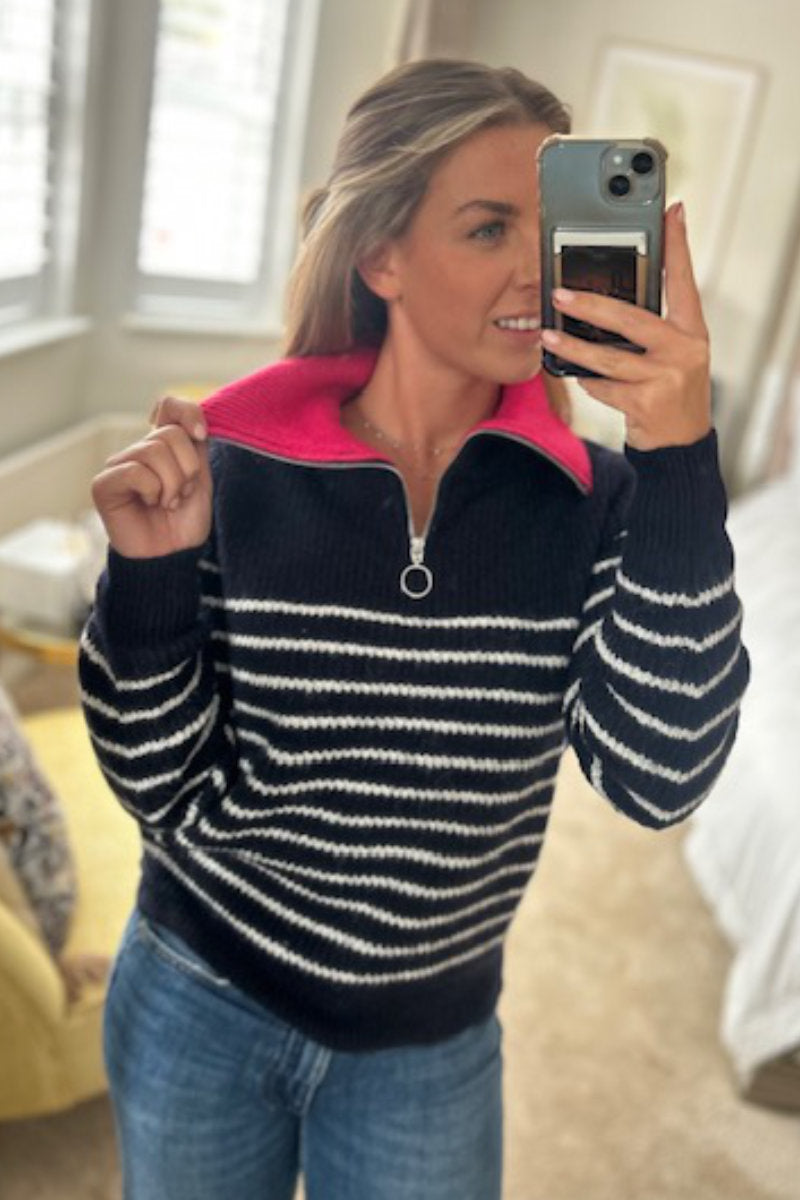 Stay cosy and stylish with this relaxed-fit navy jumper, adorned with classic white stripes and a bold red collar for a touch of contrast. Made from a super-soft chunky-knit fabric, this piece is designed to keep you warm and comfortable. The quarter zip neck adds a functional detail while enhancing its casual appeal. Pair it with your favourite jeans and boots for an effortlessly chic look this season.
