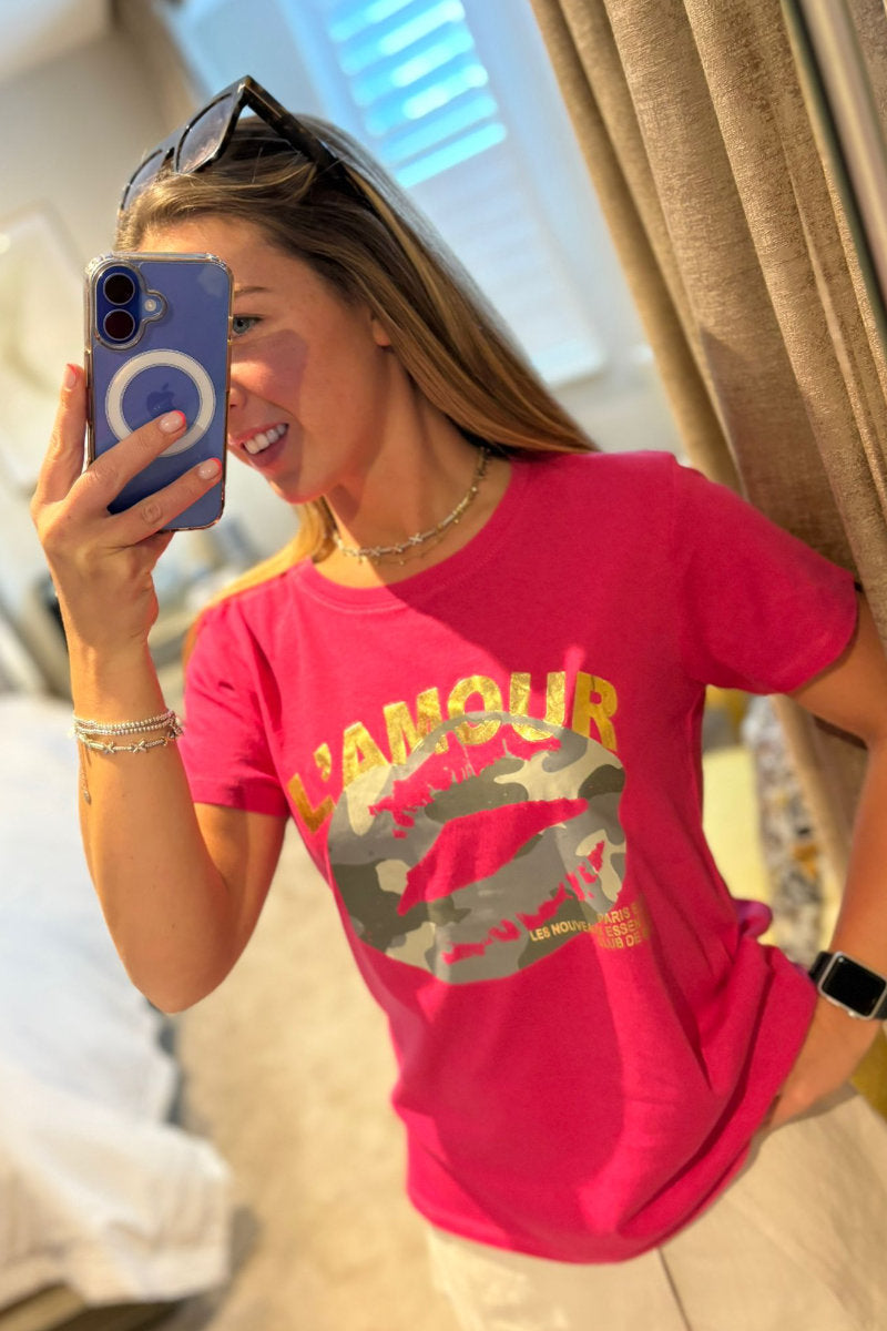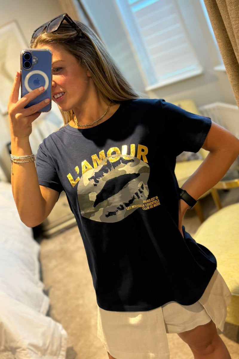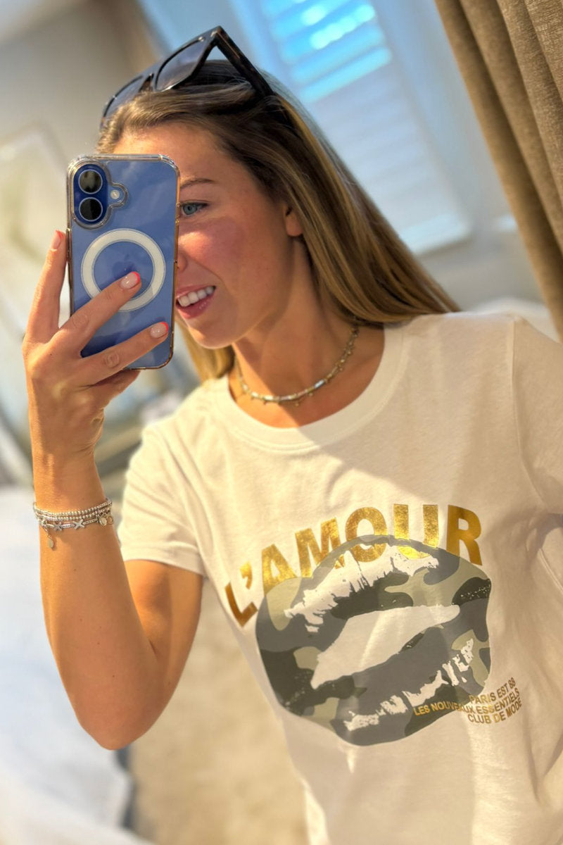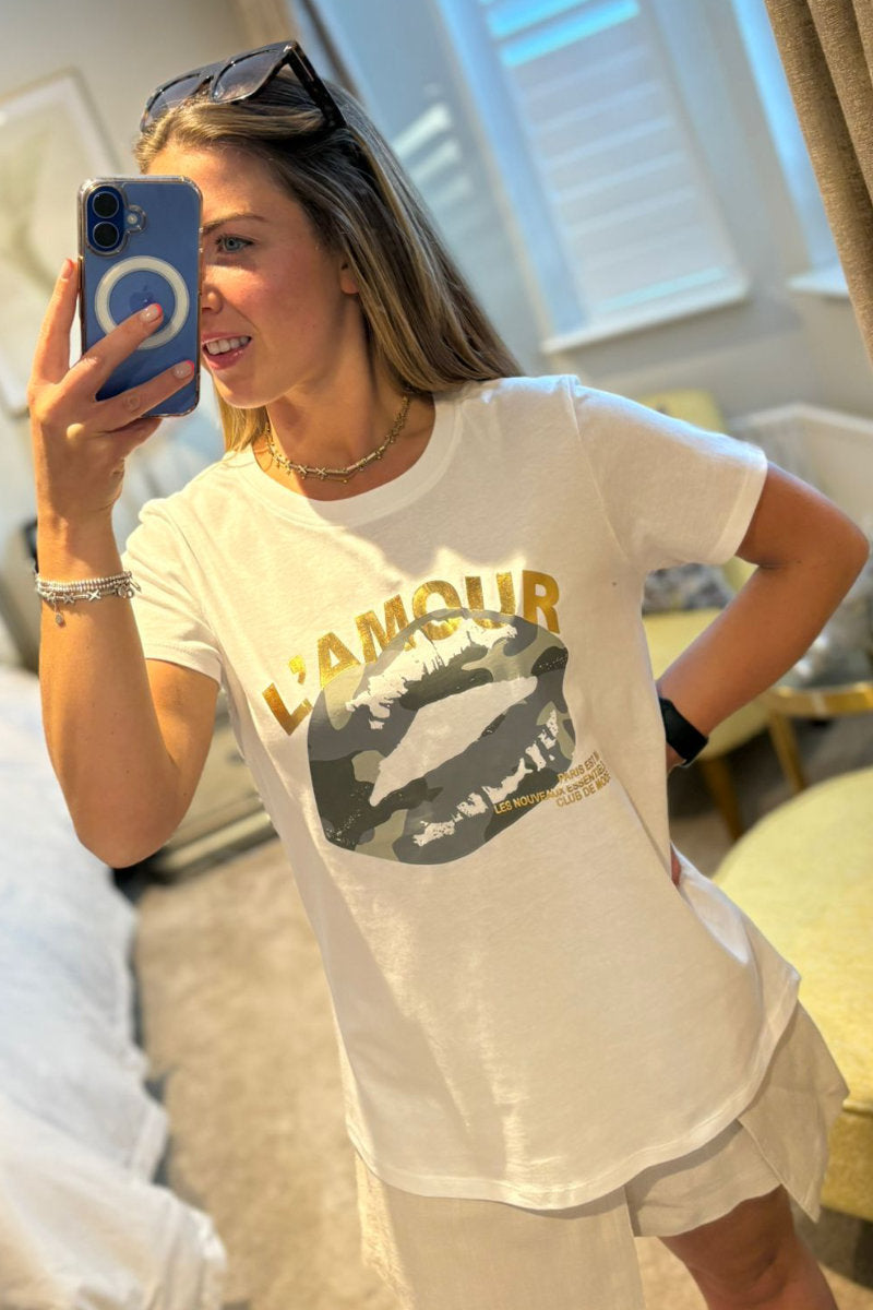 This Paramour tee delivers bold, playful style with effortless ease. Featuring a striking camouflage lip graphic and gold foil “L’AMOUR” slogan, it adds instant attitude to any casual outfit. Cut from soft 100% cotton, this relaxed-fit T-shirt pairs perfectly with denim, joggers or summer shorts.