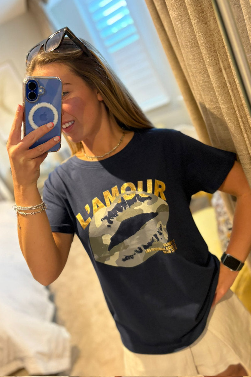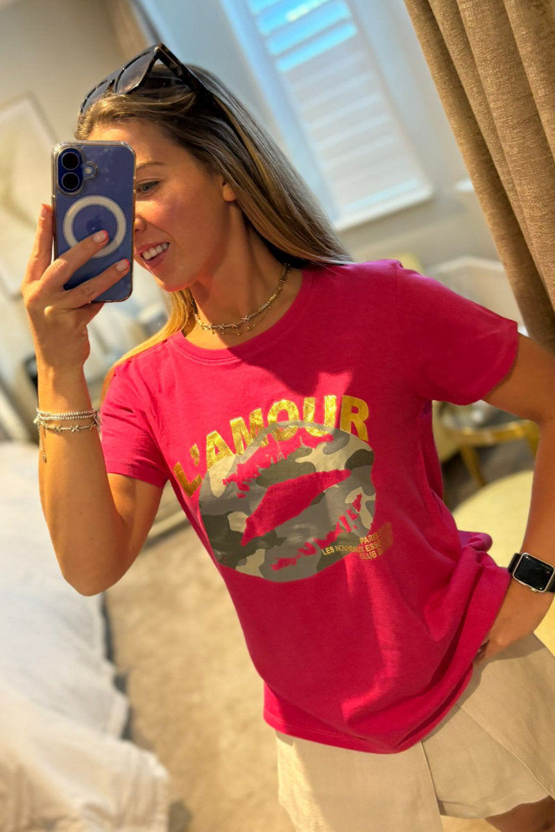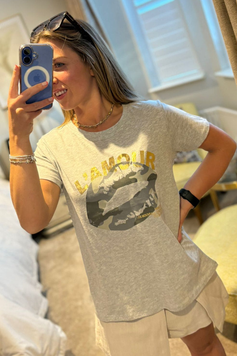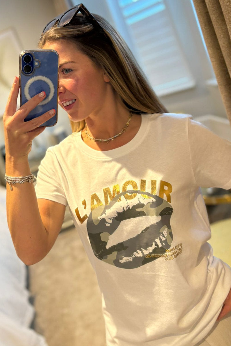 This Paramour tee delivers bold, playful style with effortless ease. Featuring a striking camouflage lip graphic and gold foil “L’AMOUR” slogan, it adds instant attitude to any casual outfit. Cut from soft 100% cotton, this relaxed-fit T-shirt pairs perfectly with denim, joggers or summer shorts.