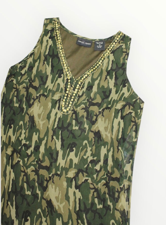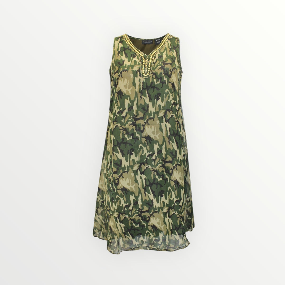 Sleeveless Camo Embellished Khaki Shift Dress Plus Size