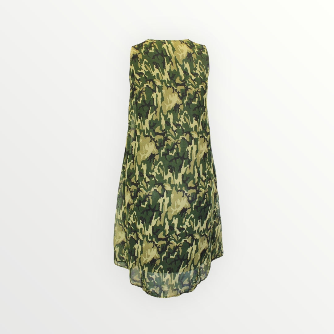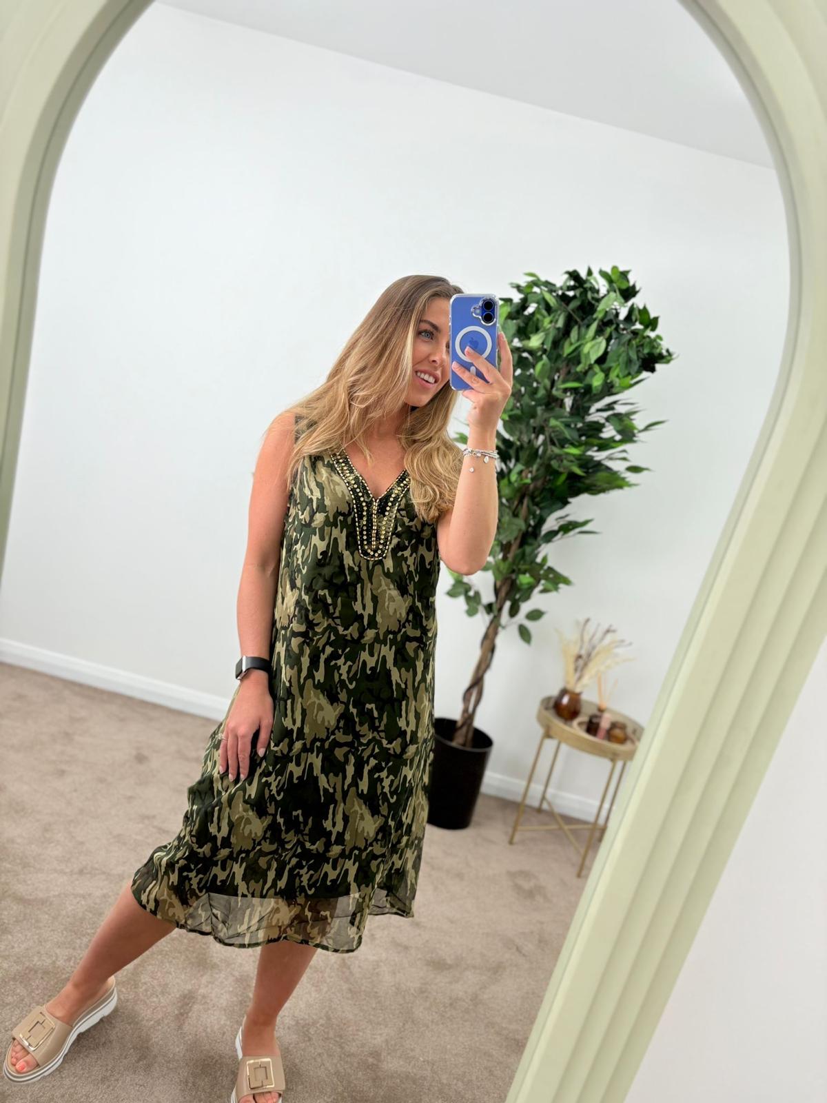 Step out in style with our sleeveless camo embellished khaki shift dress. Ideal for casual outings or dressy events, it’s a must-have for your wardrobe. Stand out and feel fabulous wherever you go!