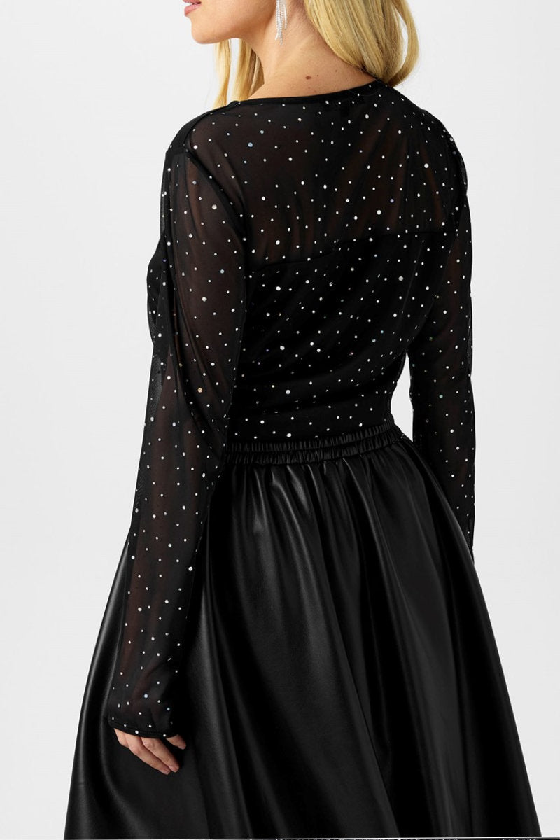 Add a dazzling touch to your wardrobe with the Sequin Mesh Top. Featuring delicate mesh fabric adorned with shimmering sequins, this long-sleeve top offers a modern twist to a classic design. Perfect for evenings out or casual chic occasions, it’s a versatile piece that will elevate your look effortlessly.