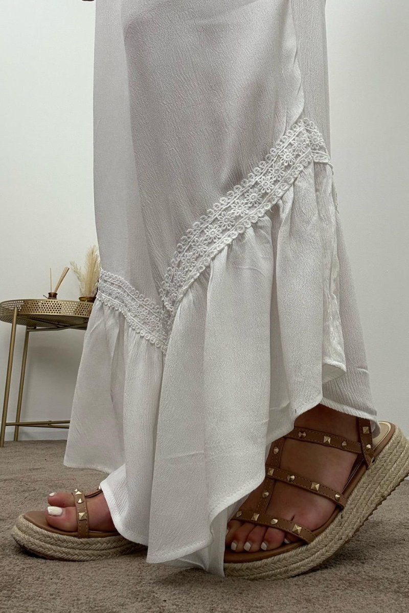 - Wide-leg shape with lace trim inserts